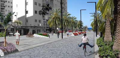 Una segunda actuación sería la que correspondería al ajardinamiento. Para ello se partiría de la estricta conservación de las alineaciones de palmeras existentes que se mantendrían y se completarían reponiendo los ejemplares desaparecidos. Se ha previsto también la generación de nuevos ámbitos arbolados que mejoren las visuales y atenúen la presencia de las grandes masas edificadas.