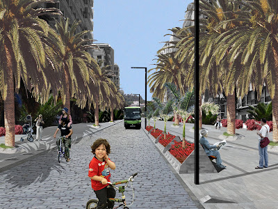 “jardineras-banco”. Una lástima que no se construya esta propuesta porque la verdad es que la zona está muy deteriorada, sobre todo los encuentros con la edificación en la parte más baja de la calle, donde la relación con los locales comerciales, bares, etc. es un disparate continuo (mejor dicho discontinuo).