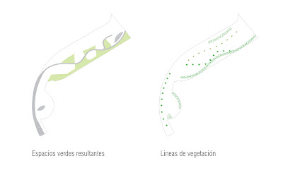 El arbolado se sitúa en alineaciones, siguiendo los recorridos principales. Junto a las zonas de estancia, se sitúa en el lado Sur, garantizando la sombra durante casi todo el día. También se logra un filtro que camufla y oculta parcialmente la visión entre el espacio público y el privado. Se ha buscado la apertura de la perspectiva hacia el mar.