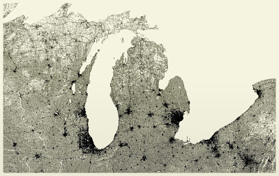 Finalmente, es fantástico el diseño que se desprende del sistema de división territorial aprobado por el Congreso de los Estados Unidos a comienzos del siglo XIX y por el cual se cuadriculó el continente más allá del río Ohio para su colonización ordenada. Un sueño de la razón y la filosofía racional todavía perceptible en la zona central del gráfico.