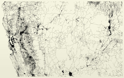 Representación gráfica de todas las carreteras y vías urbanas de los Estados Unidos. Fuente: All Streets, Ben Fry¿Qué surge cuando haces una representación digital de una sola cuestión geográfica, como la red viaria existente?Esta pregunta se la ha hecho un norteamericano llamado Ben Fry que ha estudiado la relación entre estética, diseño gráfico y visualización de datos por ordenador.Ha realizado un mapa extraordinario que contiene todos los segmentos de vías existentes en la actualidad en los Estados Unidos. El diseño abarca 26 millones de líneas que abarcan los 48 estados de ese país que se encuentran agrupados en el centro de Norteamérica.