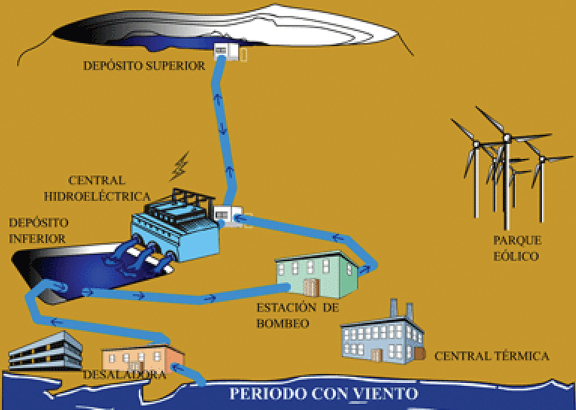 La propuesta herreña consta de dos embalses de almacenamiento y regulación de agua situados en distintas cotas que están conectados por una doble tubería a presión, en cuyo trayecto se sitúan unas turbinas que generan transforman la energía potencial a partir del agua almacenada en la parte superior. Es un sistema sencillo para el suministro eléctrico que presenta la ventaja de no consumir combustibles fósiles y, por tanto, permite el autoabastecimiento local de ese elemento tan fundamental para el futuro que es la energía.