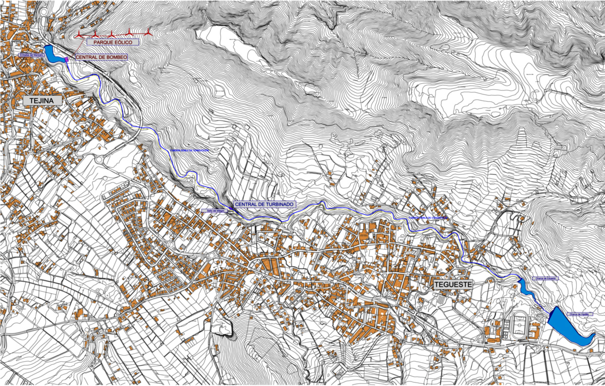 Para ello, se ha pensado el aprovechamiento y acondicionamiento al efecto de un conjunto de embalses existentes a lo largo del barranco de Agua de Dios. Son tres que tienen una cierta capacidad volumétrica, el estanque del Manicero en Tejina y las charcas de Eduardo e Hipólito en Tegueste. Presentan un desnivel entre ellos superior a 280 mts. y podrían quedar conectados por una tubería que discurra paralela al cauce y cuyo recorrido tendría una longitud apróximada de 3.800 mts.