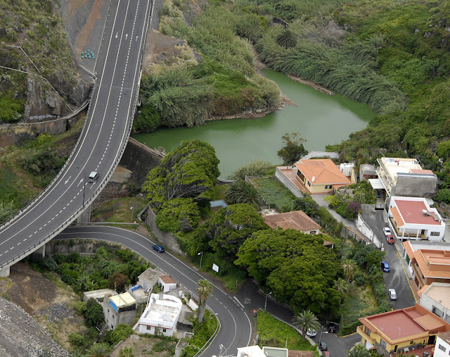 Esta misma idea sería interesante plantearla para Costa Adeje, usando la Caldera del Rey (el cráter que está encima del Siam Park) como embalse superior, establecer un segundo depósito en la depresión que bordea la calle Llanos de Troya, y colocar una central hidroeléctrica. Además tengo entendido que ya existe una instalación desaladora en la zona. La cosa sería crear un parque energético-ecológico en este lugar.