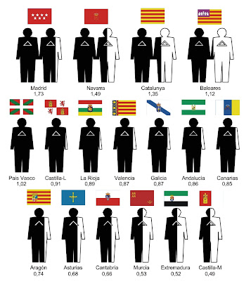 Madrid, Navarra y Cataluña serían los lugares más problemáticos para establecer una práctica razonable de la arquitectura, mientras que Murcia y Extremadura podrían ser los más benignos. Algo similar podría ocurrir en Castilla La Mancha sobre la que se podría presumir que es, no obstante, una región técnicamente dependiente de la capital. Otras zonas privilegiadas serían Cantabria, Aragón y Asturias mientras que el resto formaría un grupo compacto de comunidades en las que se podría haber percibido atenuadamente el deterioro en la rentabilidad de la arquitectura mucho antes de que llegara la actual crisis.