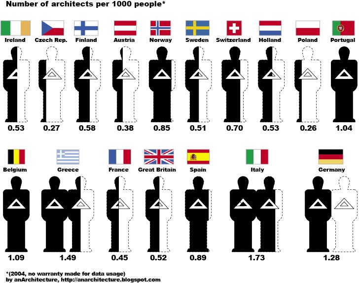 <--- Proporción de arquitectos por 1000 habitantes en los distintos paises europeos, segun Asem Abderaziq. Fuente: Blog anArchitecture