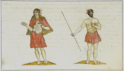 Representación de los aborígenes de la isla de La Gomera. Leonardo Torriani, 1588. Dibujo realizado para la Descrittione et historie del regno de l’Isole Canarie.—>