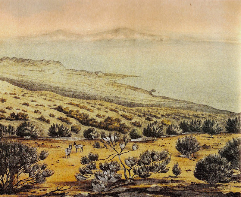 Vista de las laderas del pico Teide con la isla de La Palma al fondo. Grabado de J.Williams para la Histoire Naturelle des Illes Canaries. 1838