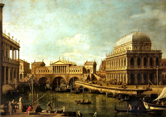 Canaletto sería un artista que plantearía interpretar sus ciudades admiradas con el objetivo de realzar su belleza. La presencia del agua en ciudades como Roma, Londres y, sobre todo, Venecia inspiraría muchas de sus precisas composiciones. En una de sus obras, denominada Capricho con edificios de Palladio de 1745, el artista intentaría prefigurar el espacio en torno al puente de Rialto veneciano con la combinación de la propuesta nunca realizada por el arquitecto de Padua, para ese monumento simbólico de la ciudad, y dos de sus edificios más significados, la famosa Basílica y el Palazzo Chiericati, ambos en la próxima Vicenza.