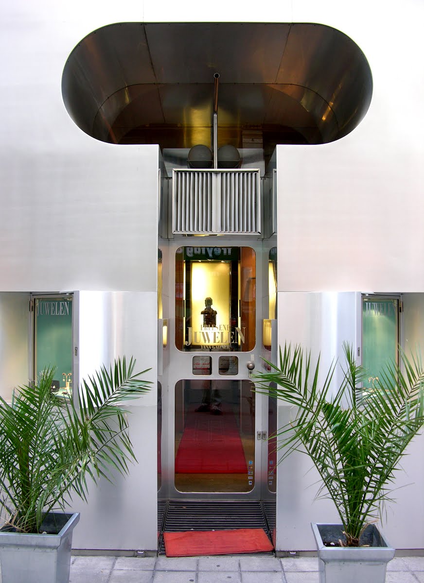 En una de ellas, la tienda de velas Retti en Kohlmarkt, realizada de 1965, utilizaría una escueta plancha continua de aluminio bruñido que enmascararía la fachada de otro edificio decimonónico. Una estrategia simbólica radical que representa una suerte de caja metálica o joyero en el que se guardan las maravillas de un interior colorista, conformado por una simple geometría de dos cubos intersectados.