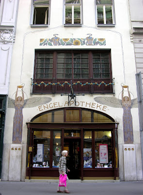 Una portada en la que aquel esfuerzo decorativo está intrínsecamente presente es el diseño que Oskar Laske hizo para el edificio de la Engel Apotheke en Bognergasse. Laske, miembro del movimiento de la Secesión Vienesa y discípulo de Wagner, se limita a redefinir la estrecha fachada del edificio estableciendo una estructura de simetría con un doble hueco central que definen el espacio de la farmacia en las plantas baja y primera, El motivo ornamental principal se establece con la aplicación de dos mosaicos idénticos que representan a sendos ángeles que reciben pociones desde lo alto.