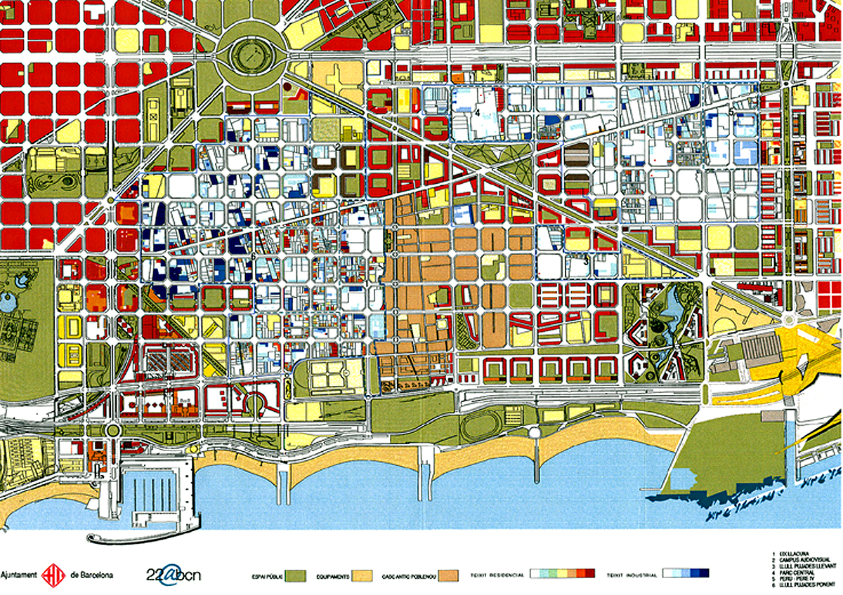 En la zona Noreste de Barcelona, bajo el manto del llamado Distrito de Actividades 22@ (una modificación del antiguo PGM que transforma radicalmente la antigua zona normativa 22a), se ha intervenido de una manera fragmentaria, añadiendo paulatinamente nuevos pedazos transformados de ciudad. Desde la precursora villa Olímpica hasta la constitución de los recientes ámbitos especializados que se han dedicado a la biotecnología, los medios audiovisuales, las telecomunicaciones y la energía, pasando por la actuación del citado Forum de las Culturas. Todos ellos proyectados a partir de instrumentos urbanísticos concretos y armados mediante estructuras y burocracias de gestión específica, formadas por sociedades privadas ad hoc, pero con una parte sustancial de capital público. Solo en los ámbitos 22@ se ha intervenido en más de 2 millones de metros cuadrados de suelo neto edificable, dando carta de naturaleza a la transformación hacia un tejido urbano más complejo de usos diversificados, comerciales, de oficinas, hoteleros, para la investigación avanzada, etc. La consecuencia evidente ha sido la catalización de una importante especulación inmobiliaria y la sustitución acelerada de los usos y poblaciones tradicionales, hegemonizada por intereses privados locales.