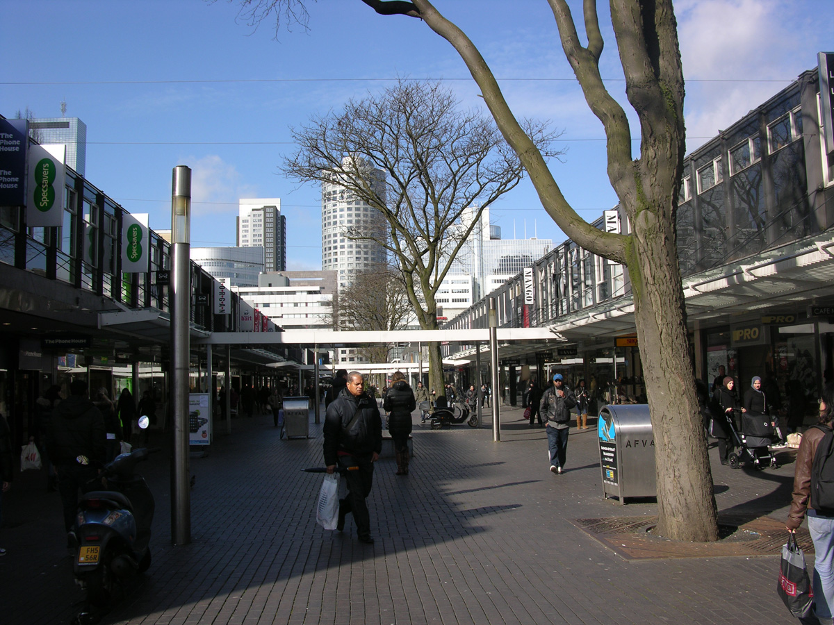 Un episodio urbanístico muy interesante de estos años, que surge en el contexto de aquel programa general del Basis Plan, fue el diseño y articulación de la primera zona comercial abierta completamente peatonal, el área de Lijnbaan que se abriría al uso público en 1953. Fue proyectada por los arquitectos Van den Broek & Bakema, como una calle de tiendas organizada en bloques de baja altura y amplios espacios peatonales incluyendo pequeñas oficinas, comercio minorista y grandes almacenes -como De Bijenkorf- formando así un contexto urbano vibrante, libre de vehículos y lleno de vida. Inmediatamente, se tomaría como una referencia ineludible para otras zonas peatonales que, a partir de entonces, se implementarían en muchos centros de las ciudades más desarrolladas del mundo.