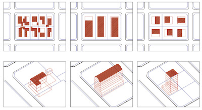 A partir de esta reflexión, se podrían identificar tres sistemas tipológicos básicos para la ordenación volumétrica de la arquitectura futura en su relación con las parcelas que la albergan, la ordenación por volúmenes adosados, los que corresponde a volúmenes aislados y los que disponen la edificación de una manera irregular.
