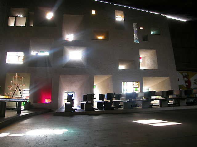 Sin embargo, el espacio que me causó mayor impacto fue la capilla semienterrada junto a la iglesia en la que los monjes celebraban cada mañana su primera misa bajo los lucernarios de colores puros, rojos, amarillos y azules. El edificio de reciente factura entonces -en aquel momento tenía escasamente una docena de años- producía un impacto extraordinario y se insertaba con una gran sabiduría en el lugar. Su lenguaje era de una gran sobriedad, expresando así poéticamente y de una manera magistral la visión del mundo que tenía la congregación que habían sido los clientes del arquitecto